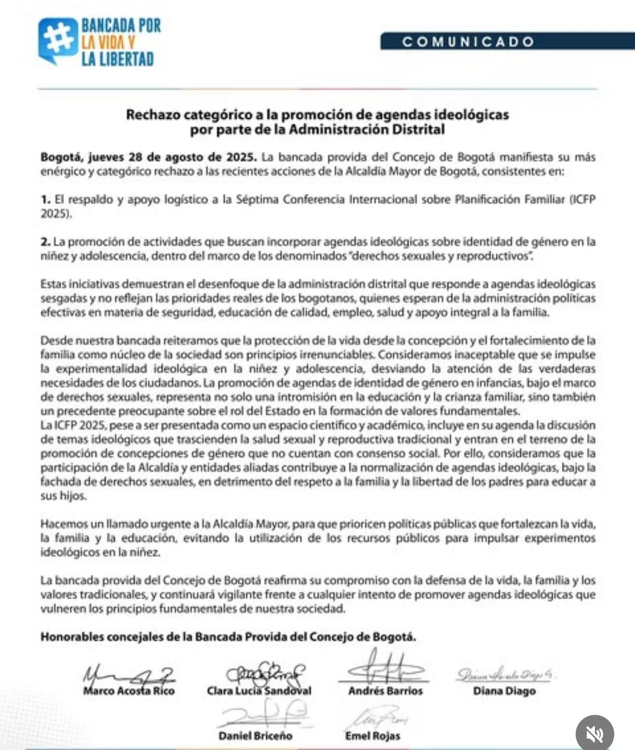 Ante el silencio del Senado y la dilución de su bancada provida, es en el Concejo de Bogotá donde queda la esperanza. A ustedes, concejales, y a cada ciudadano, les pedimos no permitir que esta ciudad se convierta en plataforma de ideologías que destruyen la vida y la familia.